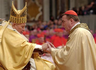 Cardinal Josip Bozanic of Croatia, Archbishop of Zagreb receives his ring from Pope John Paul (news - web sites) II during a Mass with the newly elevated Cardinals in St. Peter's Basilica, at the Vatican (news - web sites), Wednesday, Oct. 22, 2003. A day after giving the new members of the College of Cardinals their trademark scarlet hat, the pontiff presented the men with their cardinals' rings, which symbolize their link to the Church and the pope. (AP Photo/Osservatore Romano)
