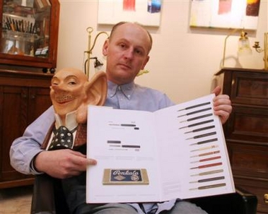 Antiques dealer Miroslav Tischler holds a book on the original mechanical pencil and a bust of its inventor Slavoljub Penkala in Zagreb, Croatia, Wednesday Jan. 25, 2006. A Croatian museum on Wednesday displayed the world's first mechanical pencil, marking the 100th anniversary since a Croat invented the item that later became essential in everyday life around the world. (AP Photo/Filip Horvat)