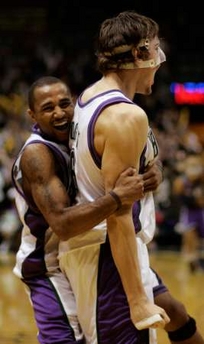 Milwaukee Bucks center Andrew Bogut from Australia (R) is hugged by guard Mo Williams (L) after hitting a short shot with seven tenths of a second left in overtime to defeat the San Antonio Spurs at the Bradley Center in Milwaukee, Wisconsin, December 20, 2005. Toni Kukoc from Croatia threw an in bounds pass to Bogut for the winning basket in the 109-107 final. REUTERS/Allen Fredrickson