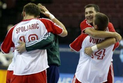 Croatia's Denis Spoljaric and Drago Vukovic embrace team mates after defeating Russia during the pool A handball competition at the Athens 2004 Olympic Games (news - web sites) August 20, 2004. Croatia defeated Russia 26-25. REUTERS/Faleh Kheiber