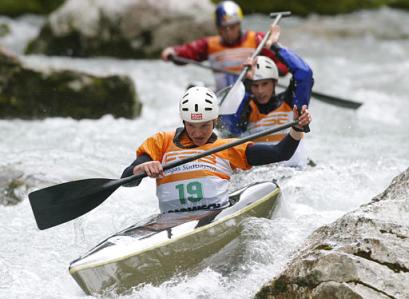 From left to right, Tomislav Hohnjec, Tomislav Jepan and Igor Grojic, from Croatia, paddle their canoes down the Loisach River near Garmisch-Partenkirchen, southern Germany, during the Wildwater World Championships on Sunday, May 23, 2004. The Croatian team won the men's C1 team event gold medal in front of the teams from France and Germany. (AP Photo/Jan Pitman)