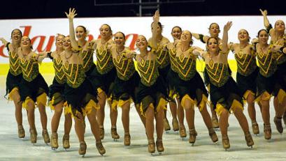 Team USA 1 performs in the free skating competition at the World Synchronized Skating Championships in Zagreb, Croatia, on Saturday, April 3, 2004. Team USA 1 won fourth place while Finland 1 won the Championships title with team Sweden 1 placing second and team Finland 2 placing third. (AP Photo/Filip Horvat)