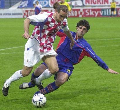 Croatia's Dado Prsa, left, is challenged by Roberto Jonas Alonsoof Andorra during a qualification match for the 2004 European FootballChampionship, in Varazdin, Croatia on Wednesday April 2, 2003. (AP Photo/HrvojeKnez)