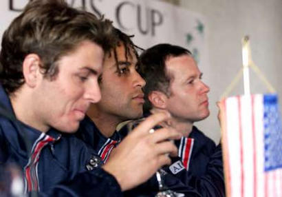 Americans Mardy Fish (L), James Blake and thecoach Patrick McEnroe (R) follow the draw for their Davis Cup tie againstCroatia in Zagreb, February 6, 2003. In spite of absence of Andy Roddick, theU.S. team is confident it will win the Croatian tie this weekend. REUTERS/NikolaSolic