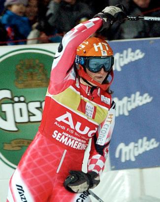 Croatia's Janica Kostelic celebrates in the finish area afterwinning the World Cup women's slalom race in Semmering, Austria, Sunday, Dec.29, 2002. (AP Photo/Marco Trovati)