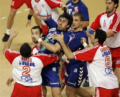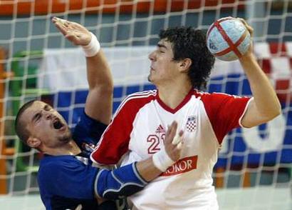 Croatian player Ivano Balic, right, competes for the ball with French player Gueric Kervadec, during the semifinal of the World Handball Championship between France and Croatia in the Rades stadium in Tunis, Tunisia, Saturday Feb. 5, 2005. (AP Photo/Remy de la Mauviniere) AP - Feb 05 9:48 AM
